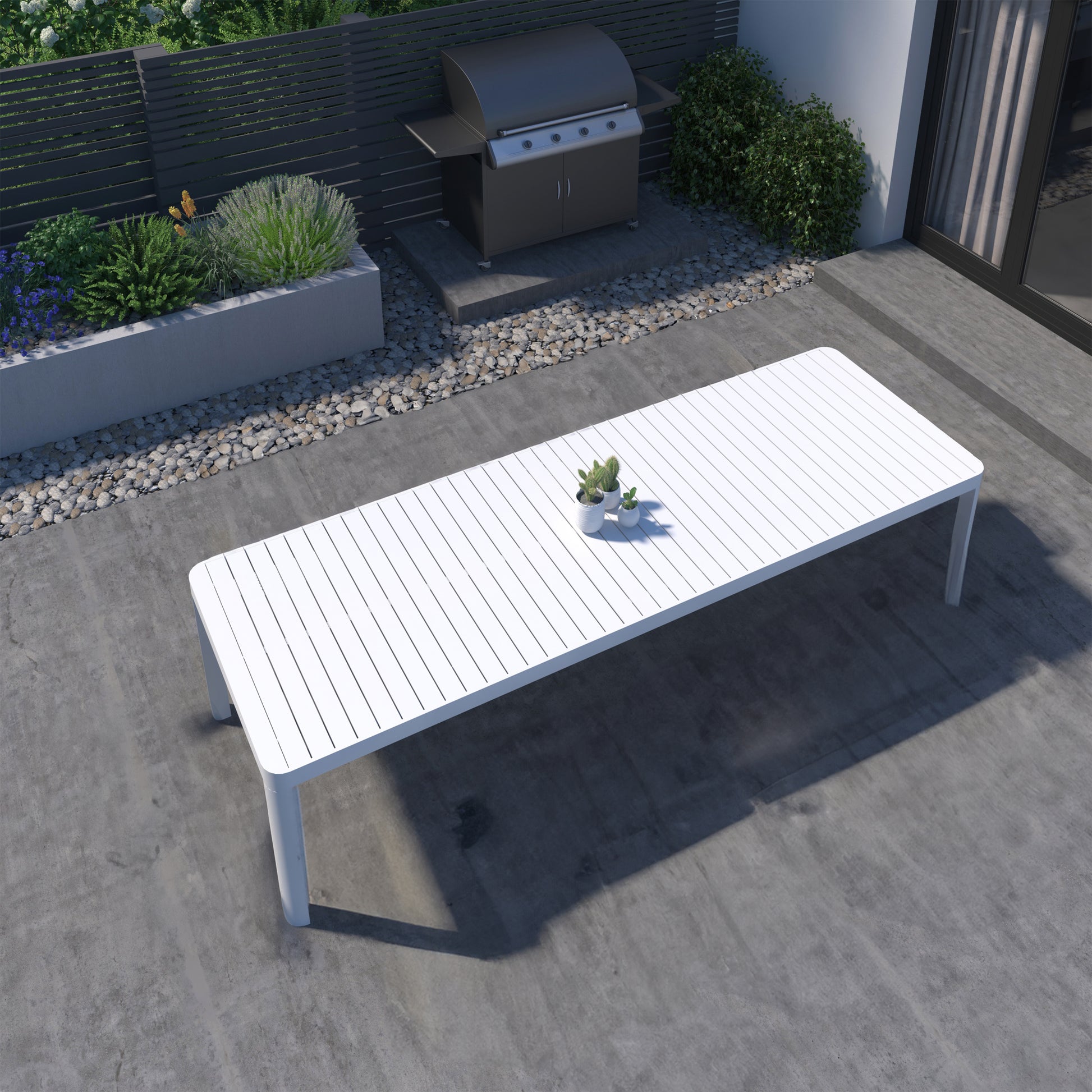 • Table Materials: Featuring a rust-resistant aluminum frame and a Duraboard® top simil wood, this table offers strength, style, and low maintenance.