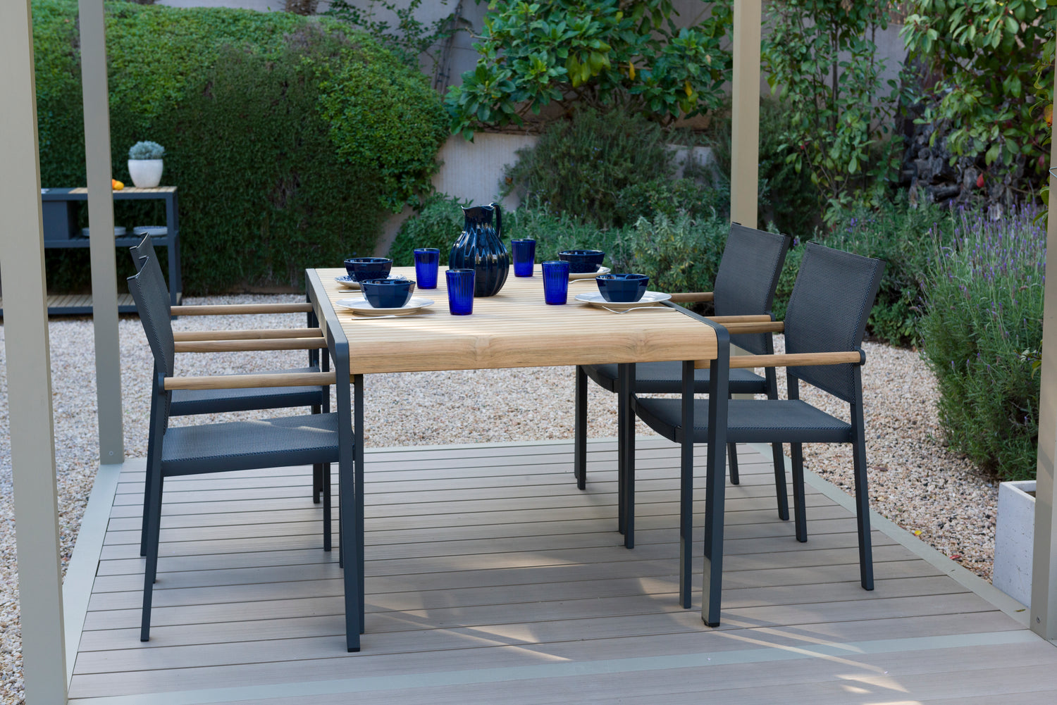 Expertly crafted with 100% FSC teak wood and durable aluminum, the Amber Rectangular Dining Table is the perfect addition to your outdoor dining space. With its design, this table offers flexibility for accommodating guests and its sustainable materials ensure long-lasting use.