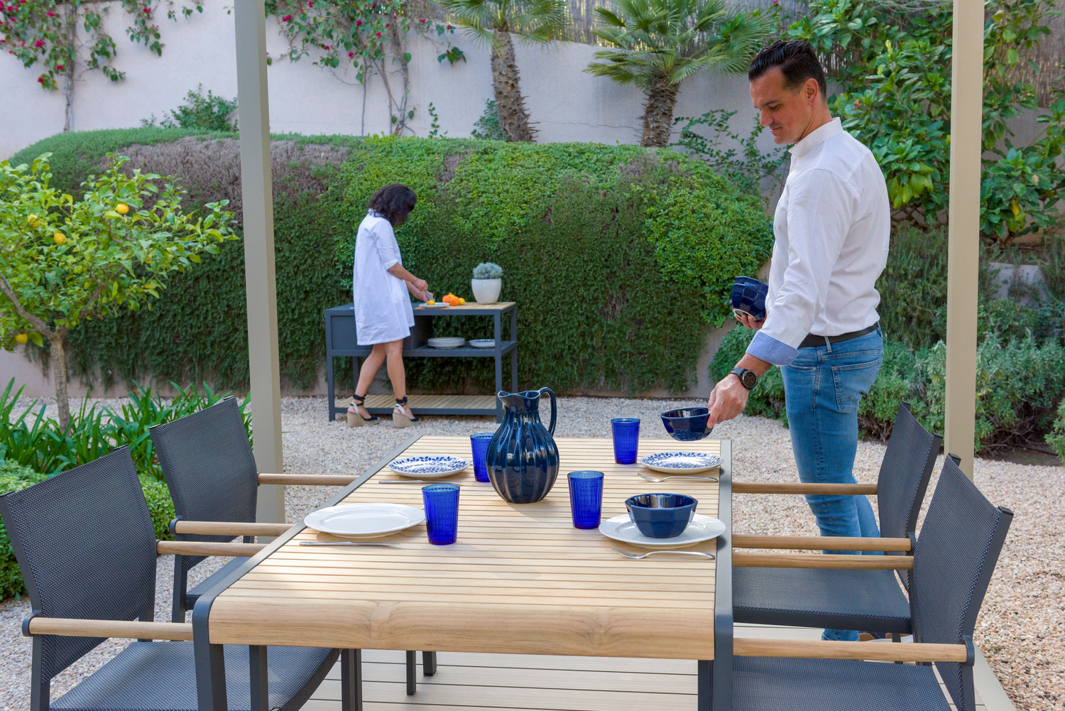 Expertly crafted with 100% FSC teak wood and durable aluminum, the Amber Rectangular Dining Table is the perfect addition to your outdoor dining space. With its design, this table offers flexibility for accommodating guests and its sustainable materials ensure long-lasting use.