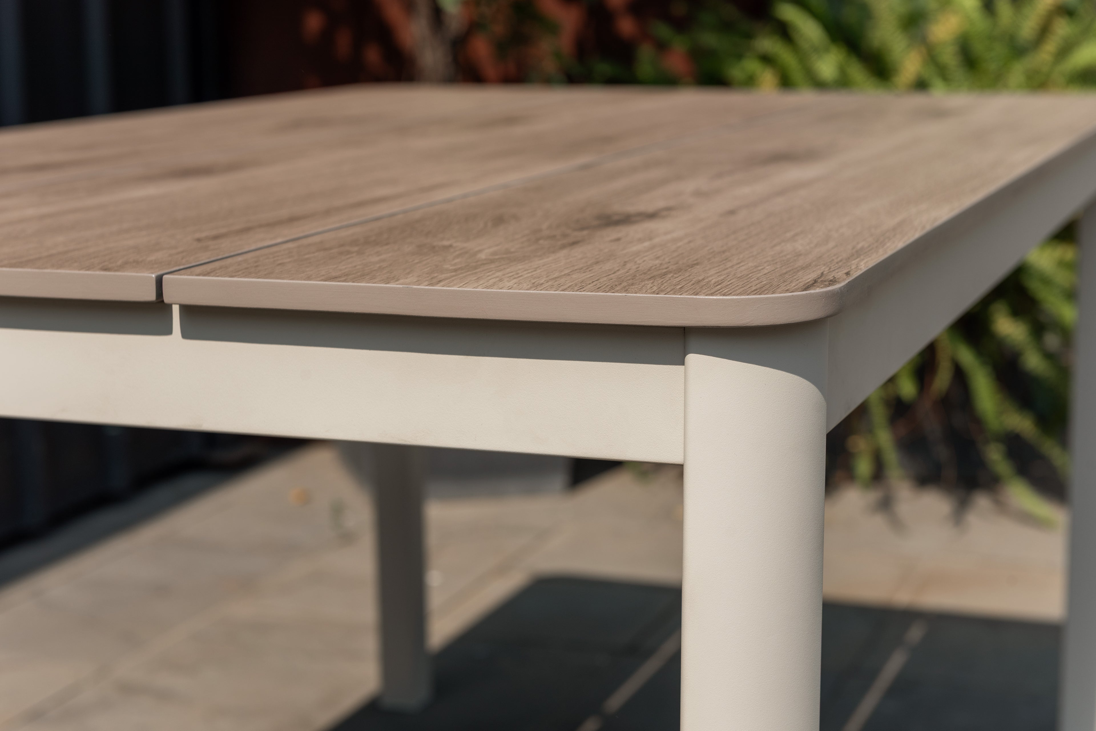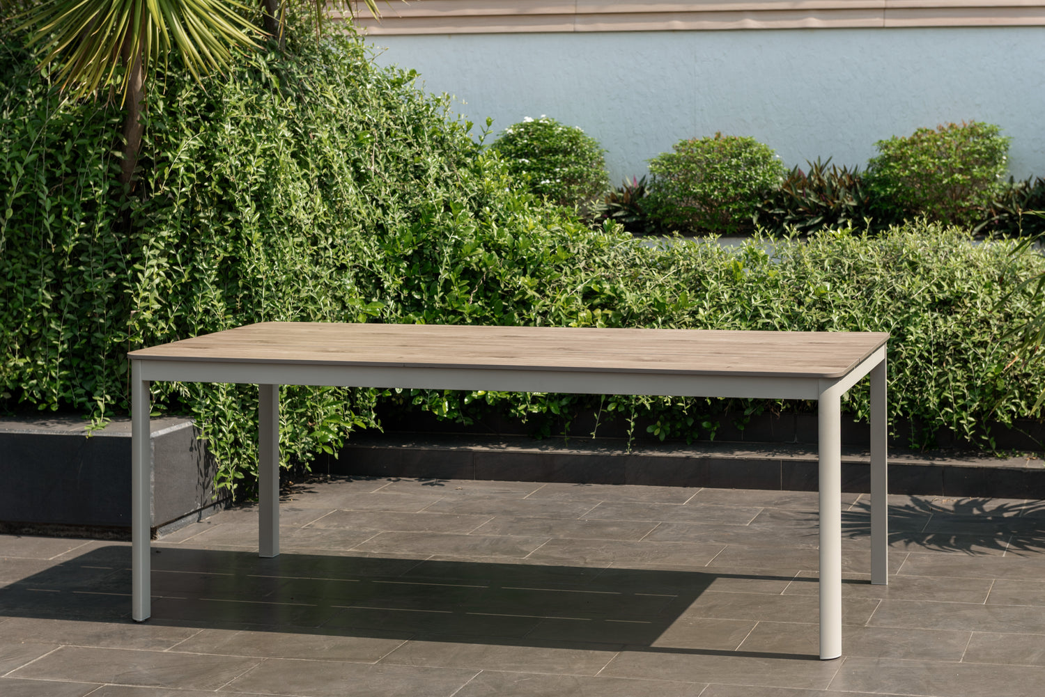 Materials: Featuring a rust-resistant aluminum frame and a Duraboard® top simil wood, this table offers strength, style, and low maintenance.