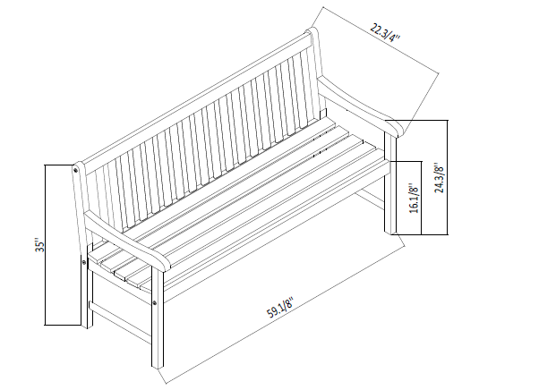 - 19Lx59Wx35H. Bench Seat: 57Lx18Wx16H