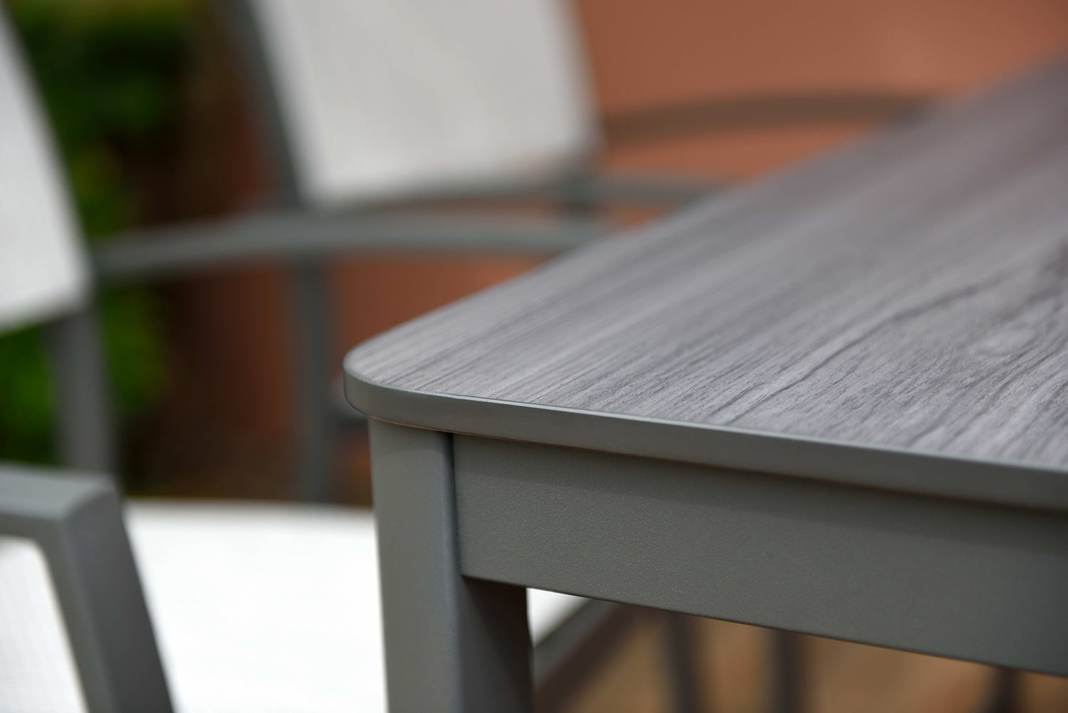 Crafted with a rust-resistant aluminum frame and a Duraboard® wood-look tabletop, this table combines durability, contemporary style, and low-maintenance convenience.