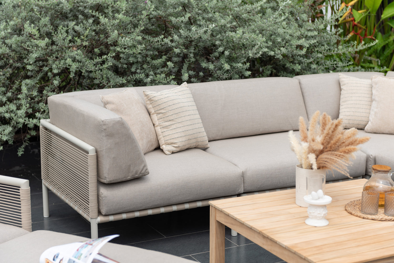 Blending sleek design with natural charm, the Horizon Lounge Set offers a modern touch with its meticulously woven beige rope detailing. The deep all-weather cushions provide ultimate comfort, encasing an aluminum frame that ensures durability. The set’s warm teak accents and minimalist lines create a relaxed yet sophisticated outdoor retreat