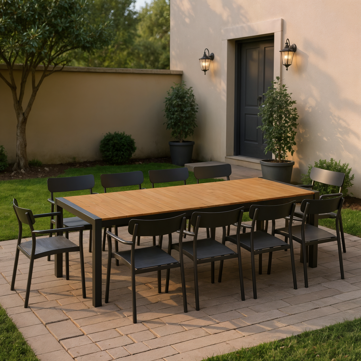 The Malo Extendable Table combines durable die-cast aluminum with FSC-certified solid wood, offering a sustainable and sturdy design. Its rectangular shape and dark finish provide a sophisticated aesthetic, while the extendable feature allows for versatile use, accommodating varying guest numbers with ease. Ideal for both everyday dining and special occasions, this table balances functionality with refined craftsmanship.