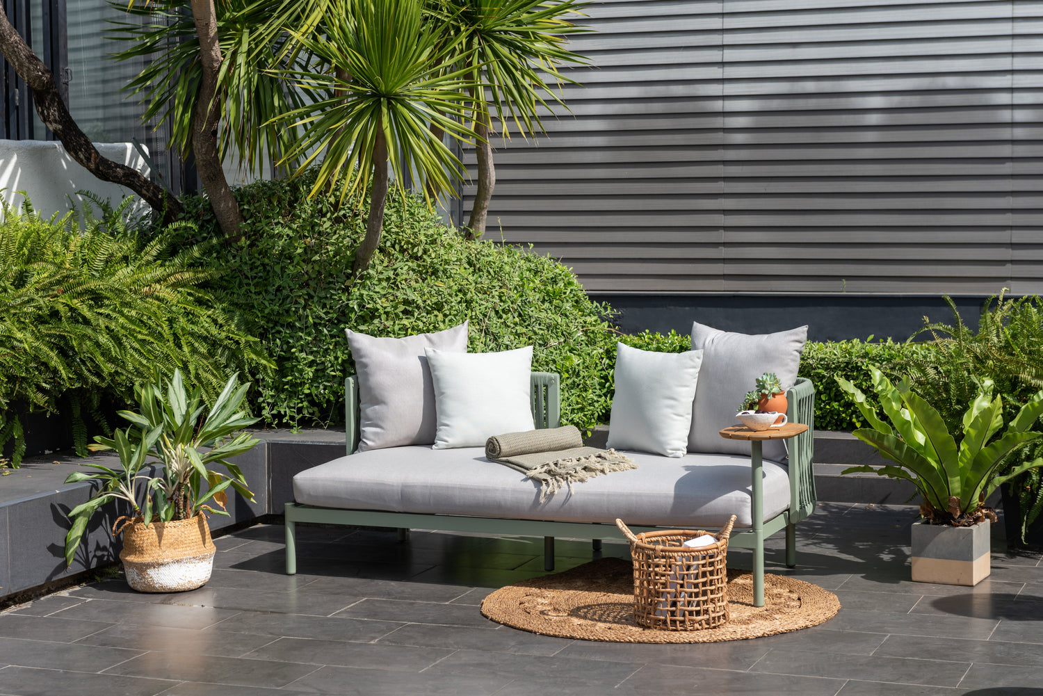 Mica Collection and it's award winning design. The Mica daybed indulges the playful with open design and invites everyone to configure their space just the way they like it to be. Multi-positional backrests make up to 12 different configurations which allow MICA to fit any outdoor area - even when not much space is available - as well as for different types of use. To finish off function, accompanying MICA is a positional swivel table which adds an extra element of the practical. Wrapped in a tactile mix of matt aluminum, gorgeous FSC™ teak, soft rope, and Sunbrella fabrics, MICA adds a sensory, comfortable and snug touch to any outdoor space that is both vibrant and calming at the same time.
