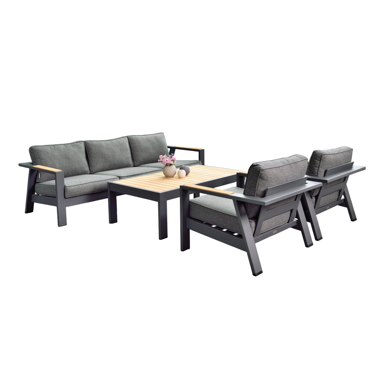 the FSC™-certified wood of the armrests and coffee table introduces a touch of mid-century surfer vibes, enhancing the set’s relaxed, coastal charm.