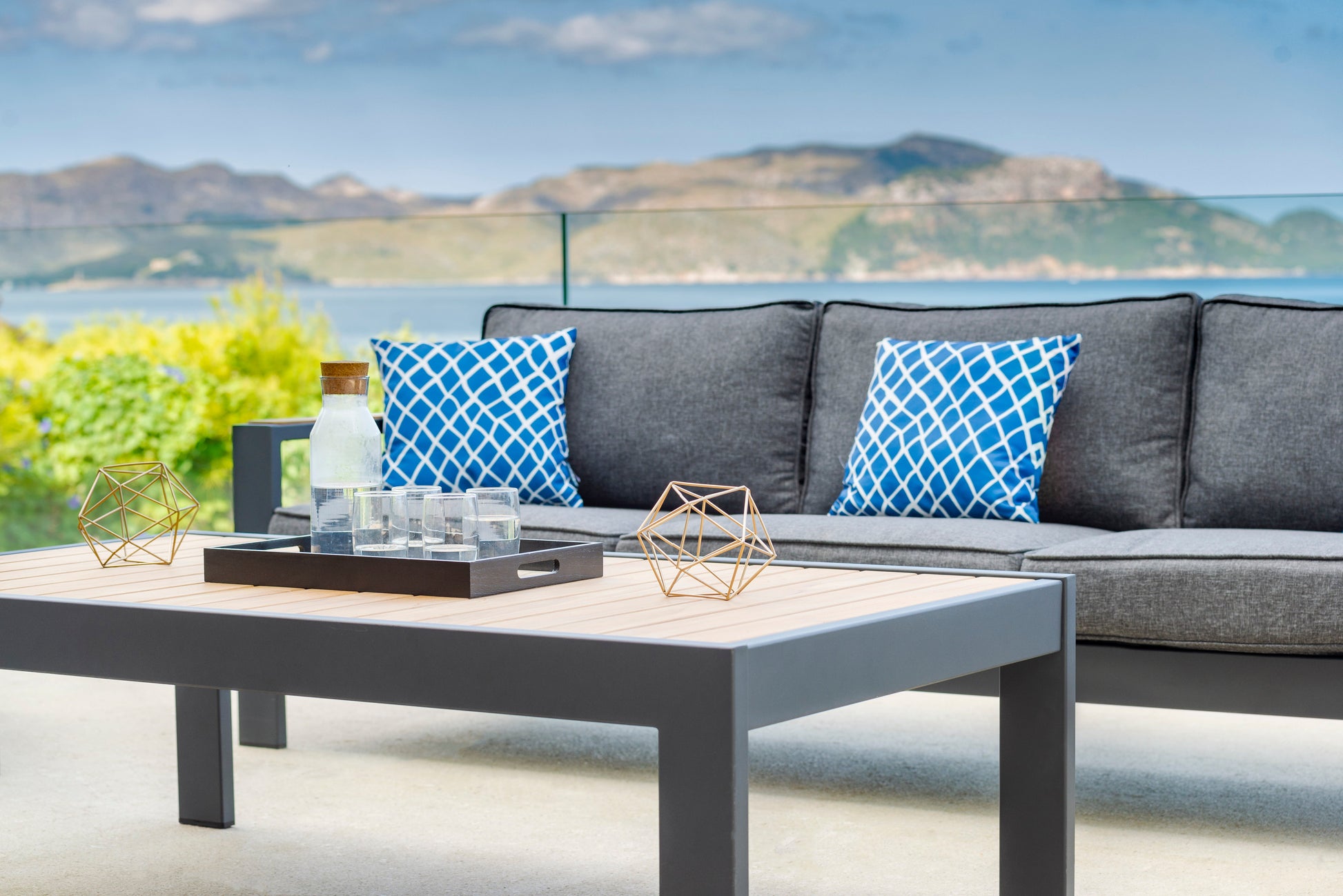 The Palau set features a robust yet graceful frame that mirrors the enduring strength and delicate curves of the coastline. The sleek wave-like contours of the legs evoke the continuous ebb and flow of water, adding a sense of tranquility and balance to any outdoor space. Complementing the cool hues of the frame, the FSC™-certified wood of the armrests and table introduces a touch of mid-century surfer vibes, enhancing the set’s relaxed, coastal charm.