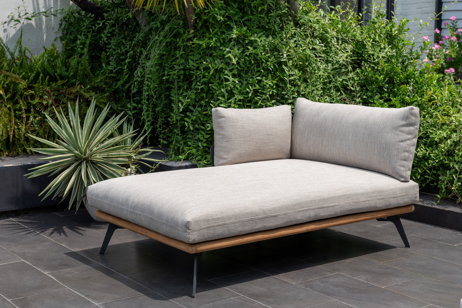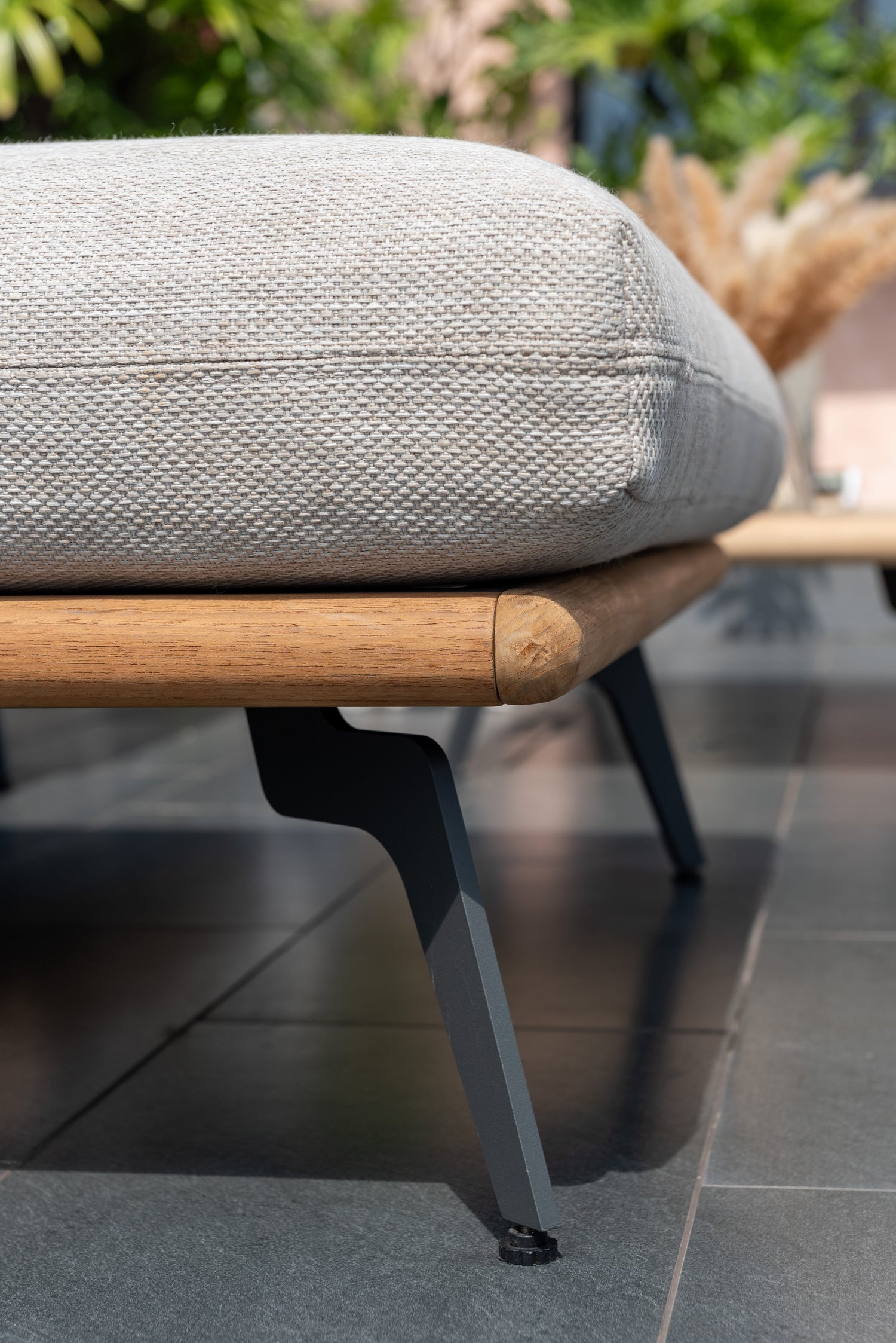 Teak & frames made of die-cast aluminum, which offers stability and robustness while also being lightweight and easy to move. They are also coated with Duracoat®, an enviromentally friendly powder coating. This combination gives you the best outdoor performance, with a high weather resistance and low maintenance.