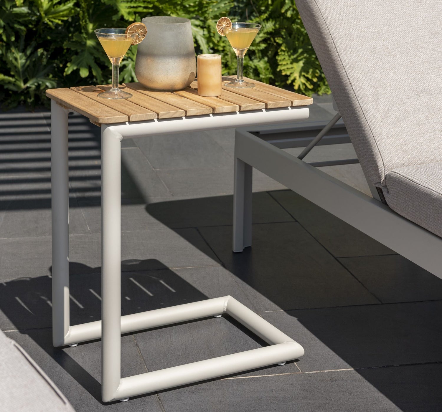 This sleek, modern aluminum side table is the perfect addition to any outdoor living space. Made with a strong aluminum frame and powder-coated with a weather-resistant finish, this C-Shape side table is designed to handle the elements. Its convenient design allows it to fit comfortably against any outdoor sofa or chair. Its contemporary style lends an upscale look to any outdoor space.