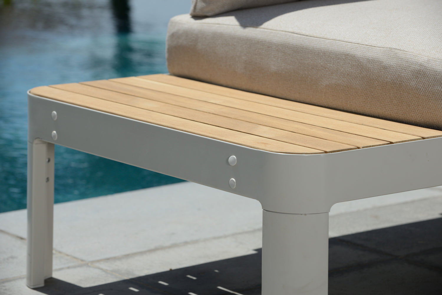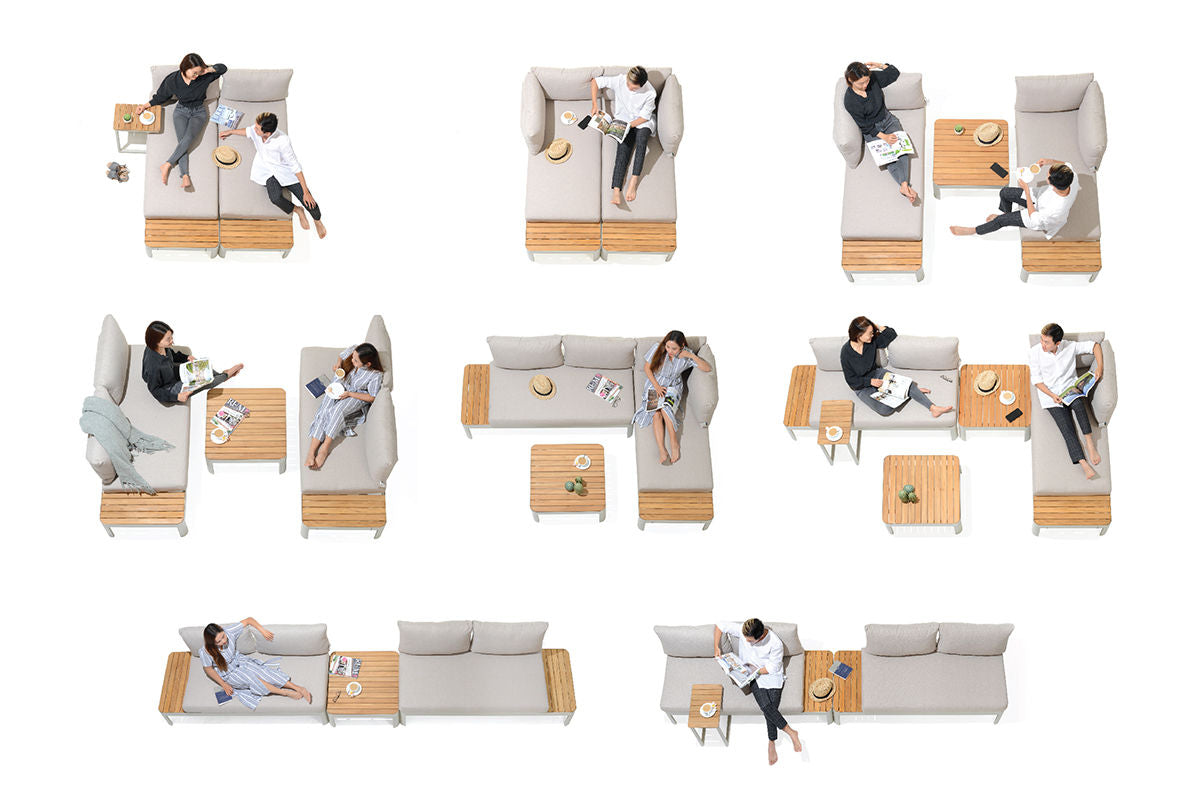 The Portals range is characterized by unique urban style and functionality – and so is its modular sofa. The table top comes with the FSC- certified Teak that creates the right balance with a little bit of touch of warmth. Elegant and durable at the same time, this sofa offers endless combinations including the removable back, ready to fulfil all your outdoor comfort needs. Table top in teak FSC. Cushions included in Olefin.