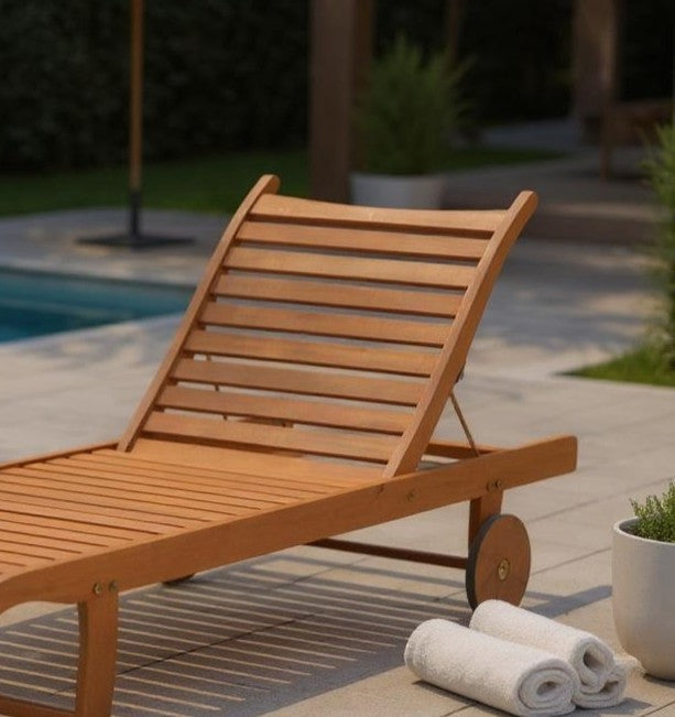 Experience outdoor relaxation with the Phuket 100% FSC Solid Wood Sun Wheel Lounger, crafted from sustainably sourced solid wood. Its durable construction ensures long-lasting comfort and stability, while the integrated sun wheels provide effortless mobility to adjust your position with ease. Designed for both style and function, this lounger enhances any outdoor space with natural elegance and expert craftsmanship. Ideal for sunbathing or lounging, it offers a reliable and eco-friendly solution for your outdoor comfort needs.