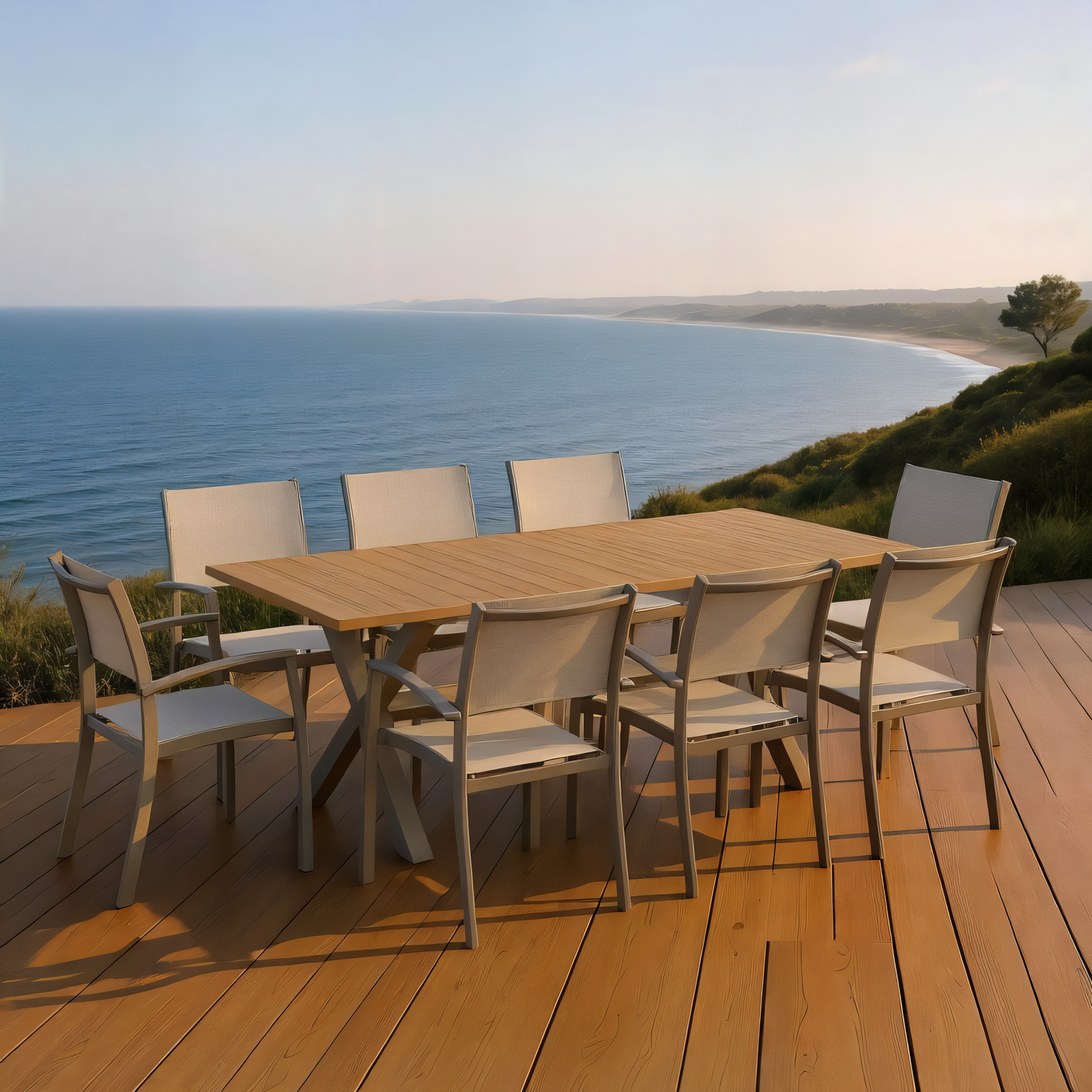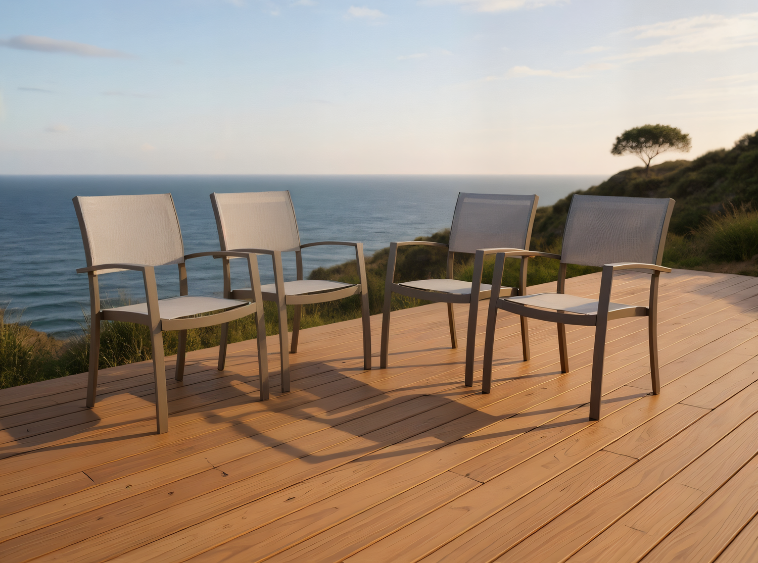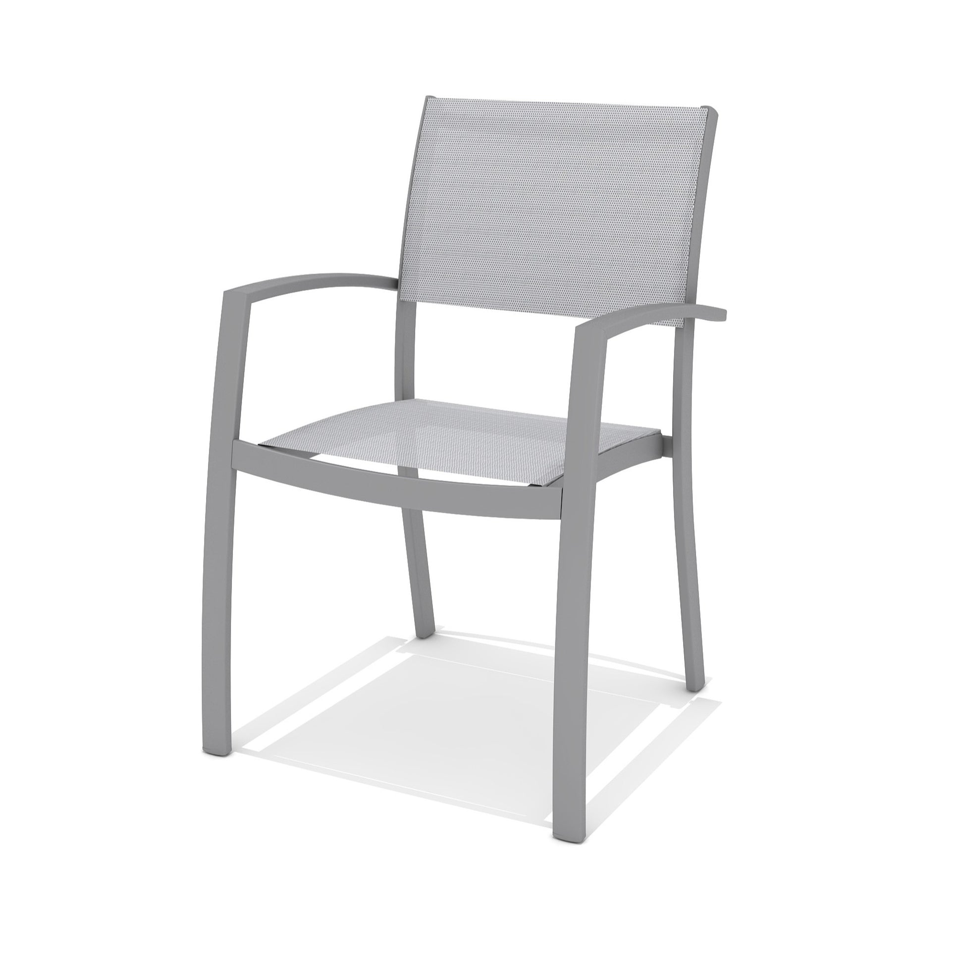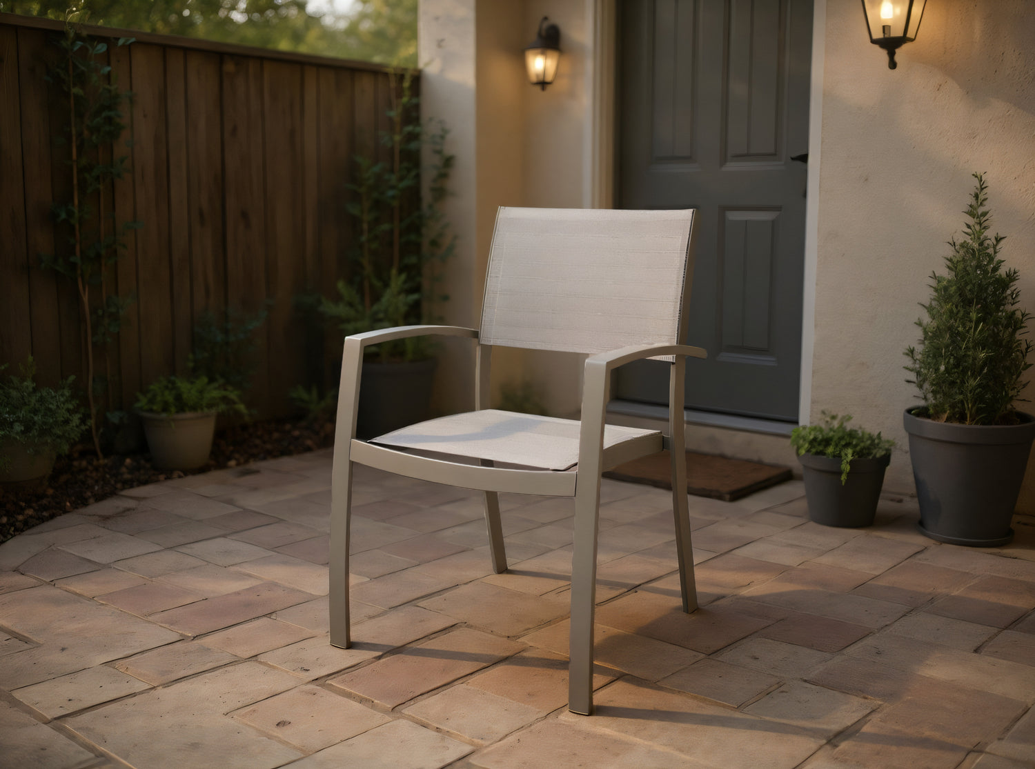 Crafted with a lightweight yet durable aluminum frame and a breathable Weather-Net® seat and back, this stacking armchair combines strength and comfort. Designed in a sleek grey color with a sanded effect, it features straight, edgy armrests and requires no maintenance for lasting outdoor use.