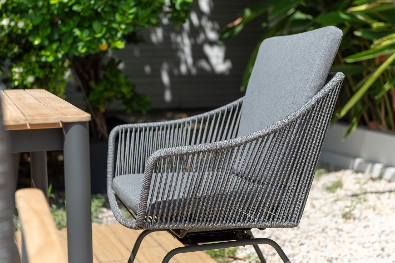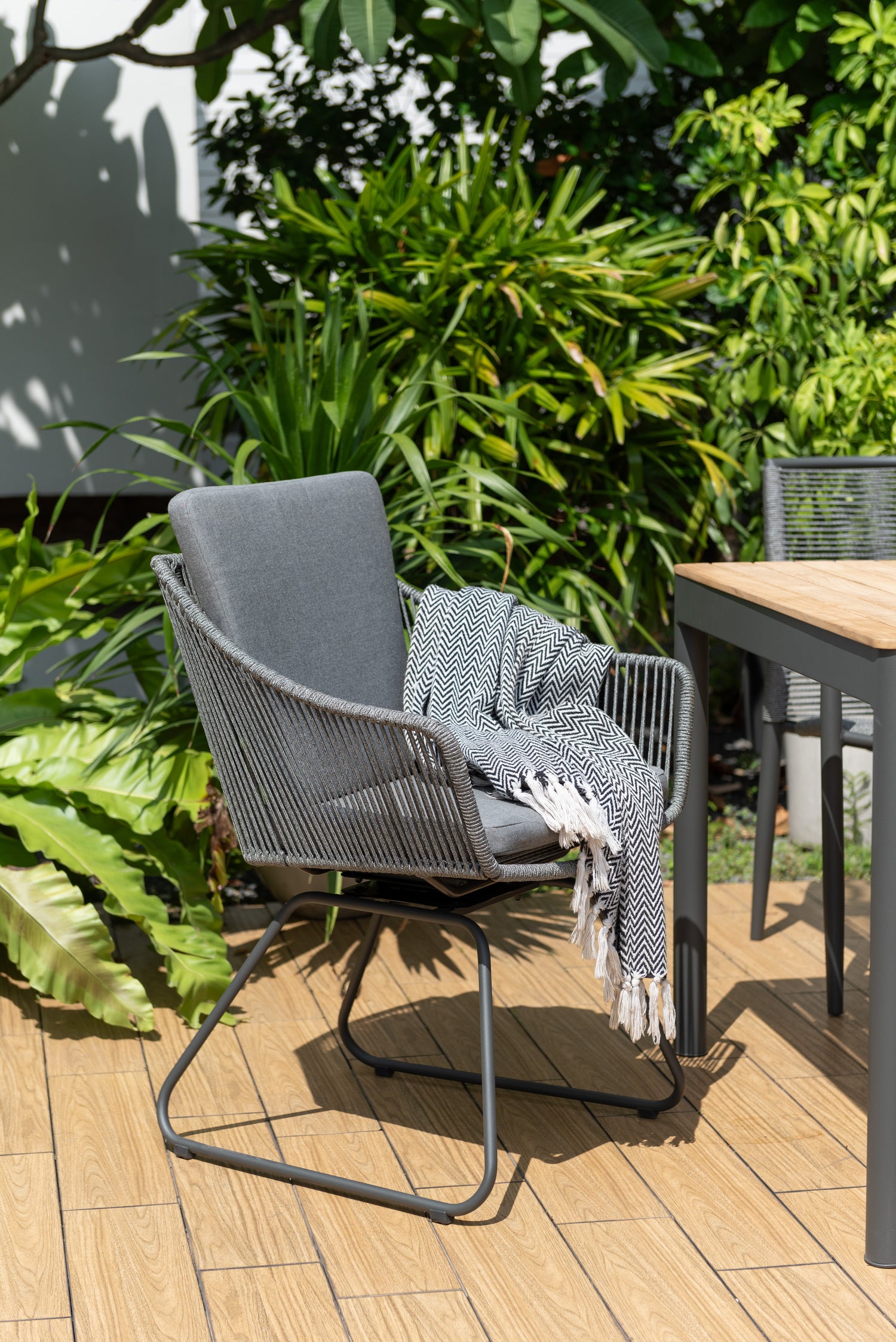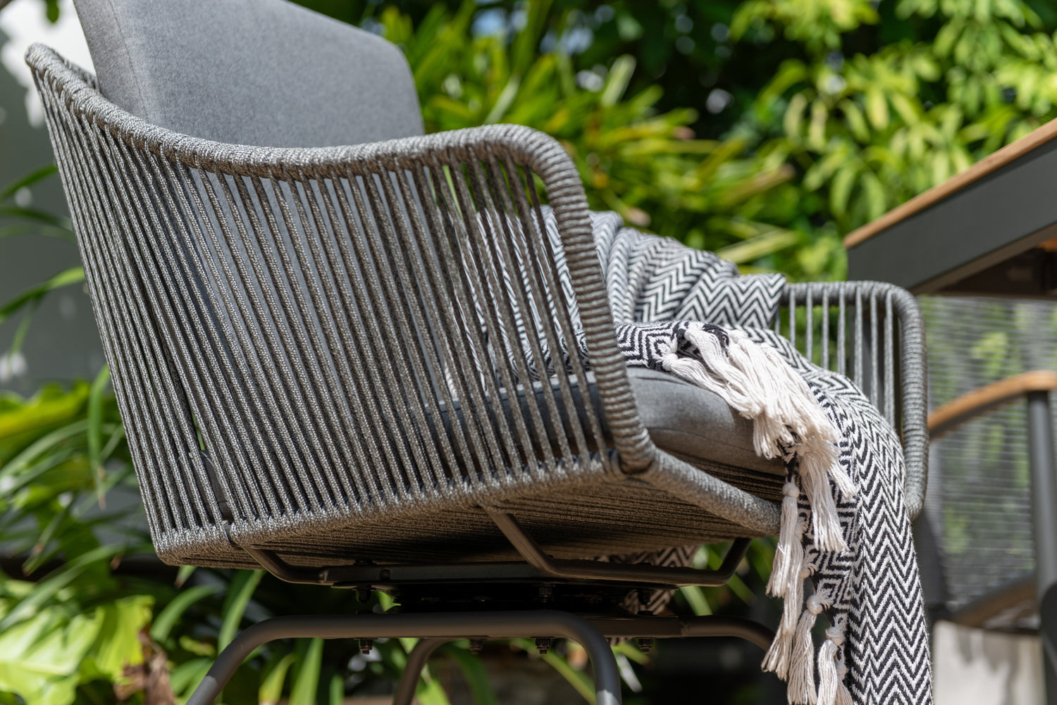 The Opal range offers a full package of stylish, premium furniture, with no compromise taken on its flexibility. The Opal outdoor swivel chair combines modern elegance with ultimate comfort, making it a perfect addition to any patio or outdoor lounge space. Designed with a sturdy steel frame for durability, it features intricately woven grey rope detailing that adds a sophisticated touch. Sunbrella cushions provide exceptional comfort and are resistant to fading, moisture, and mildew, ensuring long-lasting beauty and performance in any weather. With its sleek design and premium materials, the Opal swivel chair offers both style and functionality for outdoor living.