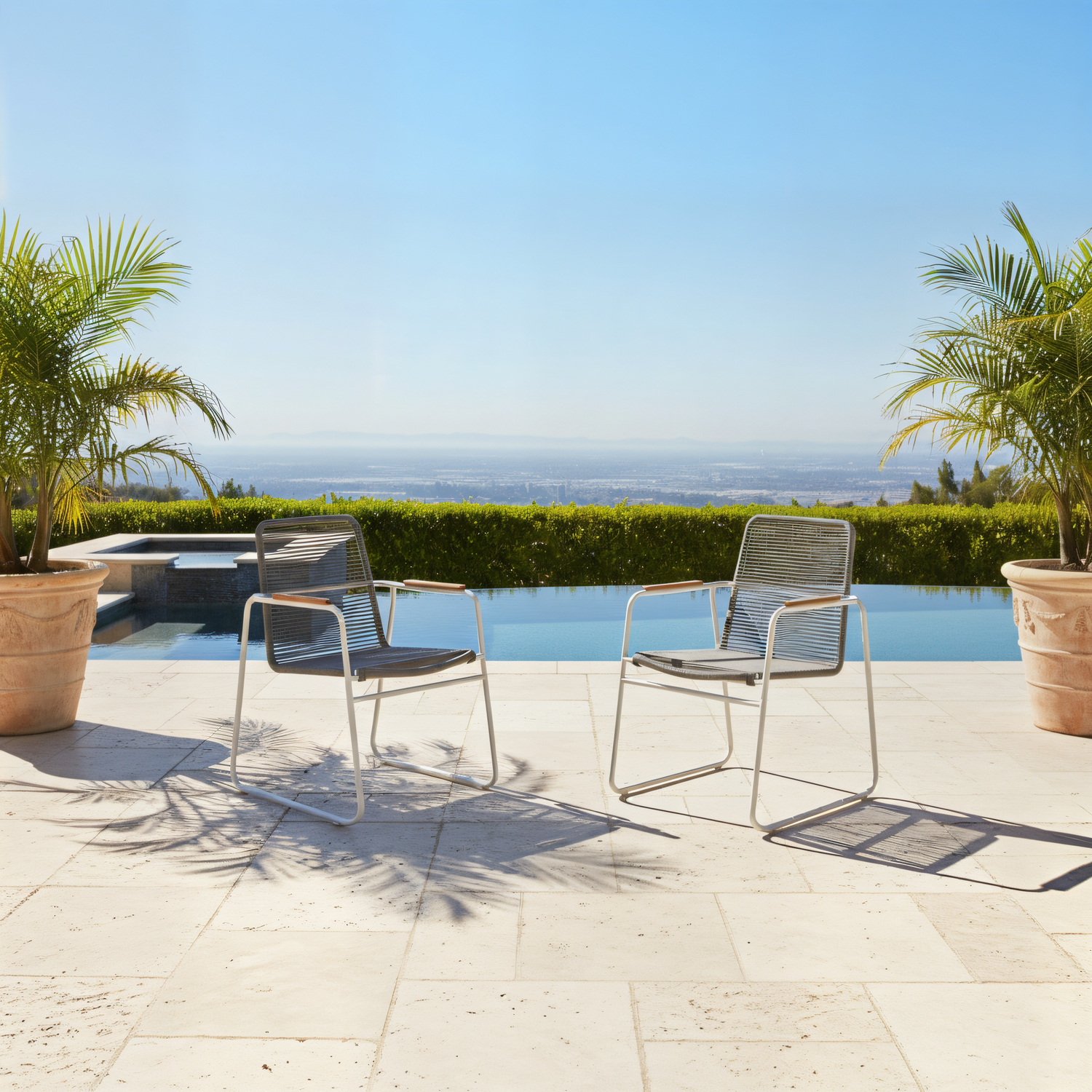 Constructed with a durable aluminum frame, teak-finish armrests, and a rope seat and back, these chairs combine lasting strength, stylish design, and comfortable support for outdoor use.